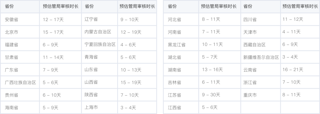 各個(gè)省管局預(yù)計(jì)審核時(shí)長(zhǎng),實(shí)際審核時(shí)長(zhǎng)會(huì)根據(jù)備案場(chǎng)景有所不同,下表格僅供參考。詳情可查看 詳細(xì)規(guī)則。